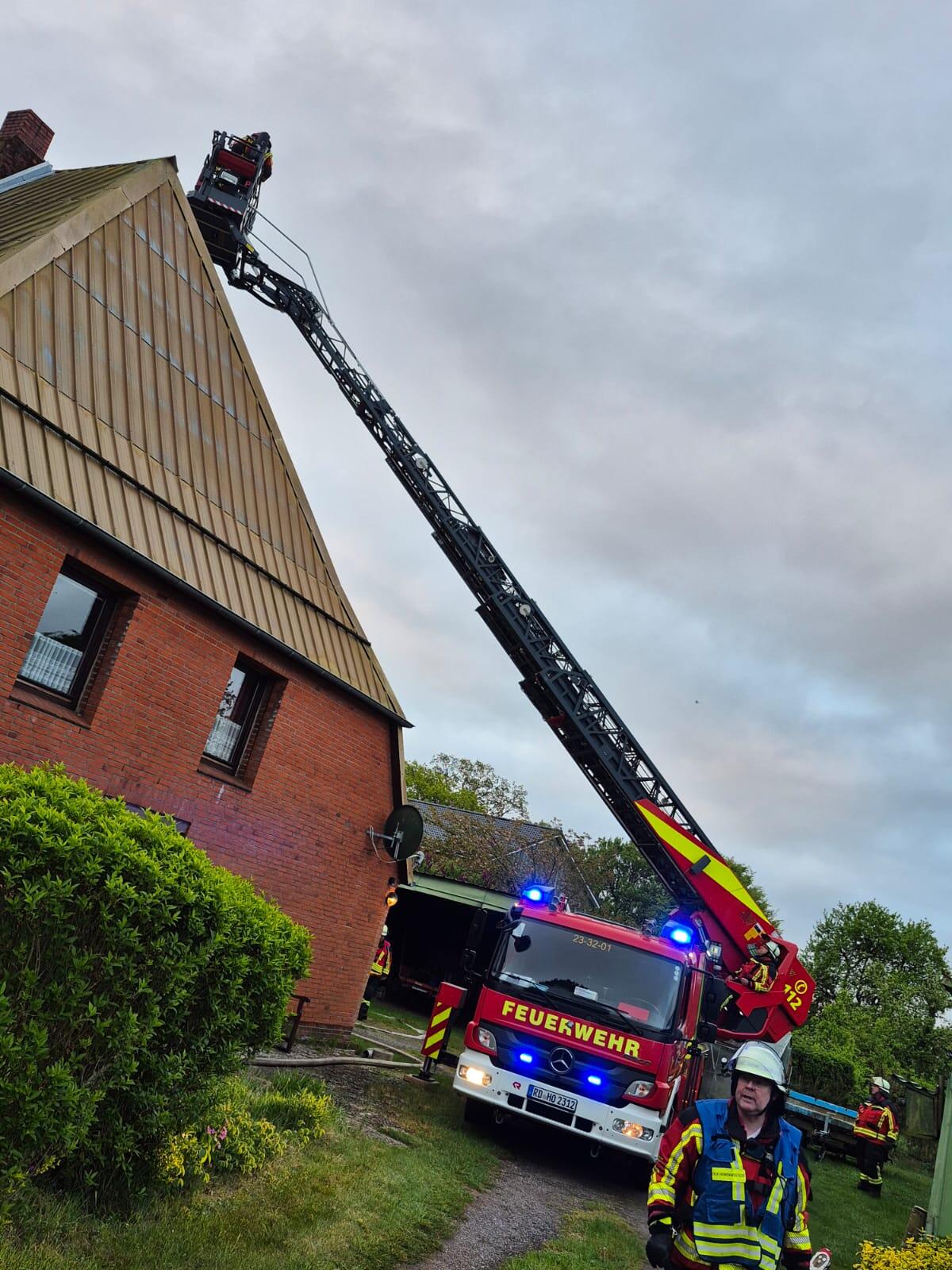 In den frühen Morgenstunden wurden wir mit unserer Drehleiter zur Unterstützung der Feuerwehr Ehndorf und Wasbek alarmiert. Da kein Schornsteinfeger erreichbar war, unterstützten wir die Kameradinnen und Kameraden vor Ort mit unserer Drehleiter sowie dem Schornsteinfeger Kehrgeschirr.