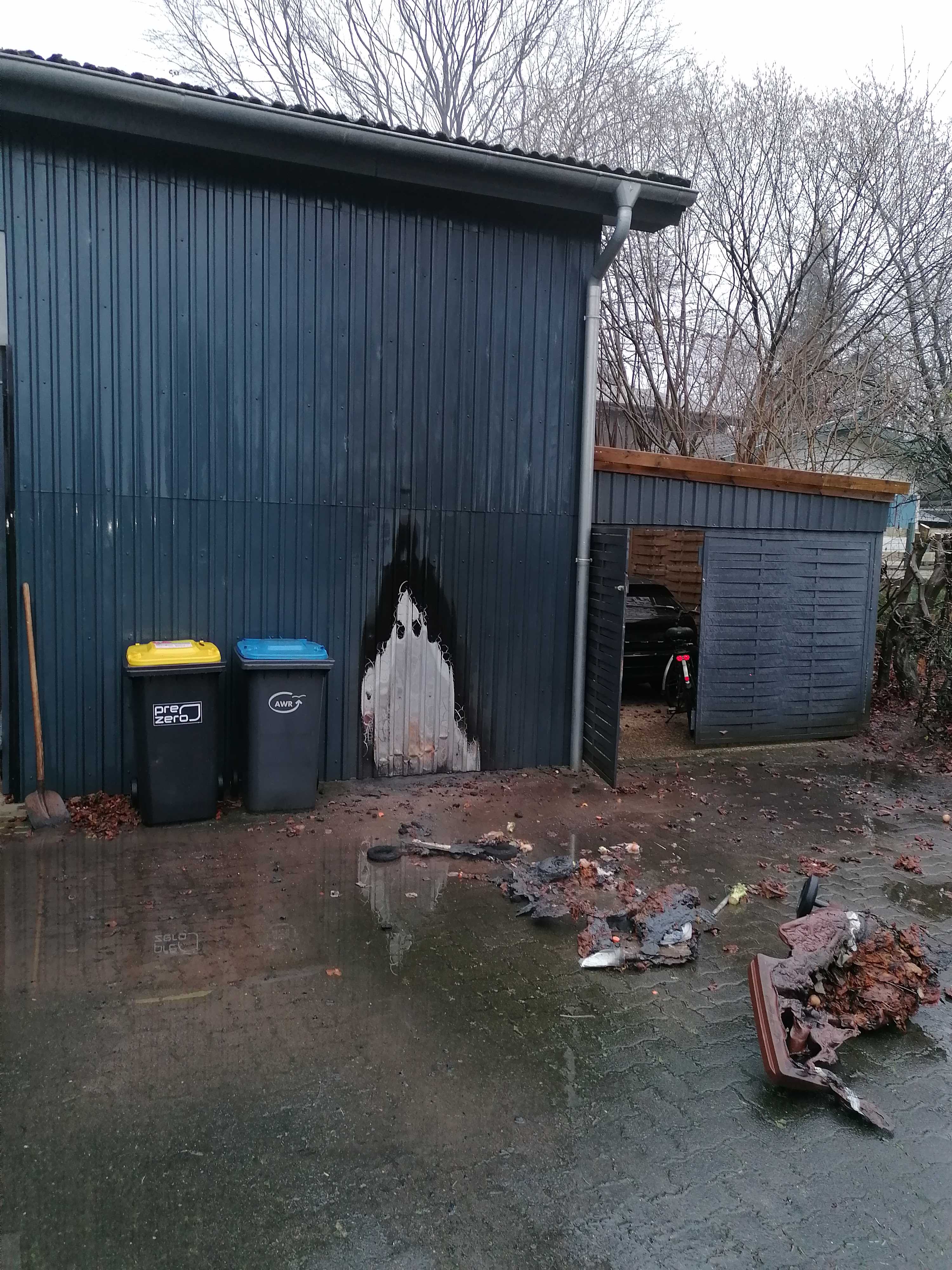 Vor Ort brannten zwei Müllbehälter an einer Werkstatt, welche jedoch durch den Anwohner weitestgehend gelöscht werden konnten. Wir löschten die Brandreste mittels C-Rohr ab und kontrollierten die Brandstelle sowie die Werkstatt mit der Wärmebildkamera, da die Flammen den Dachüberstand erreichten. Nach ca. 45 Minuten konnten wir wieder einrücken.