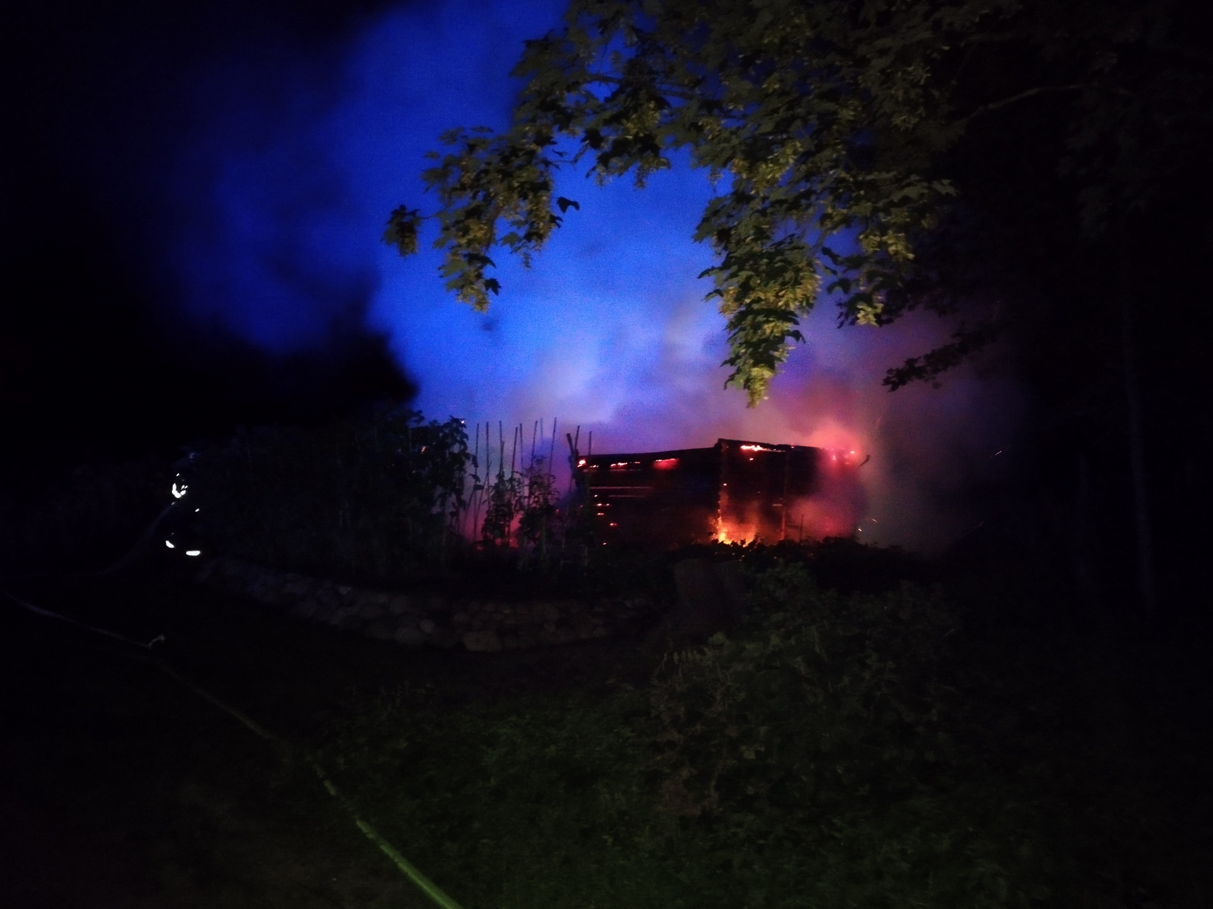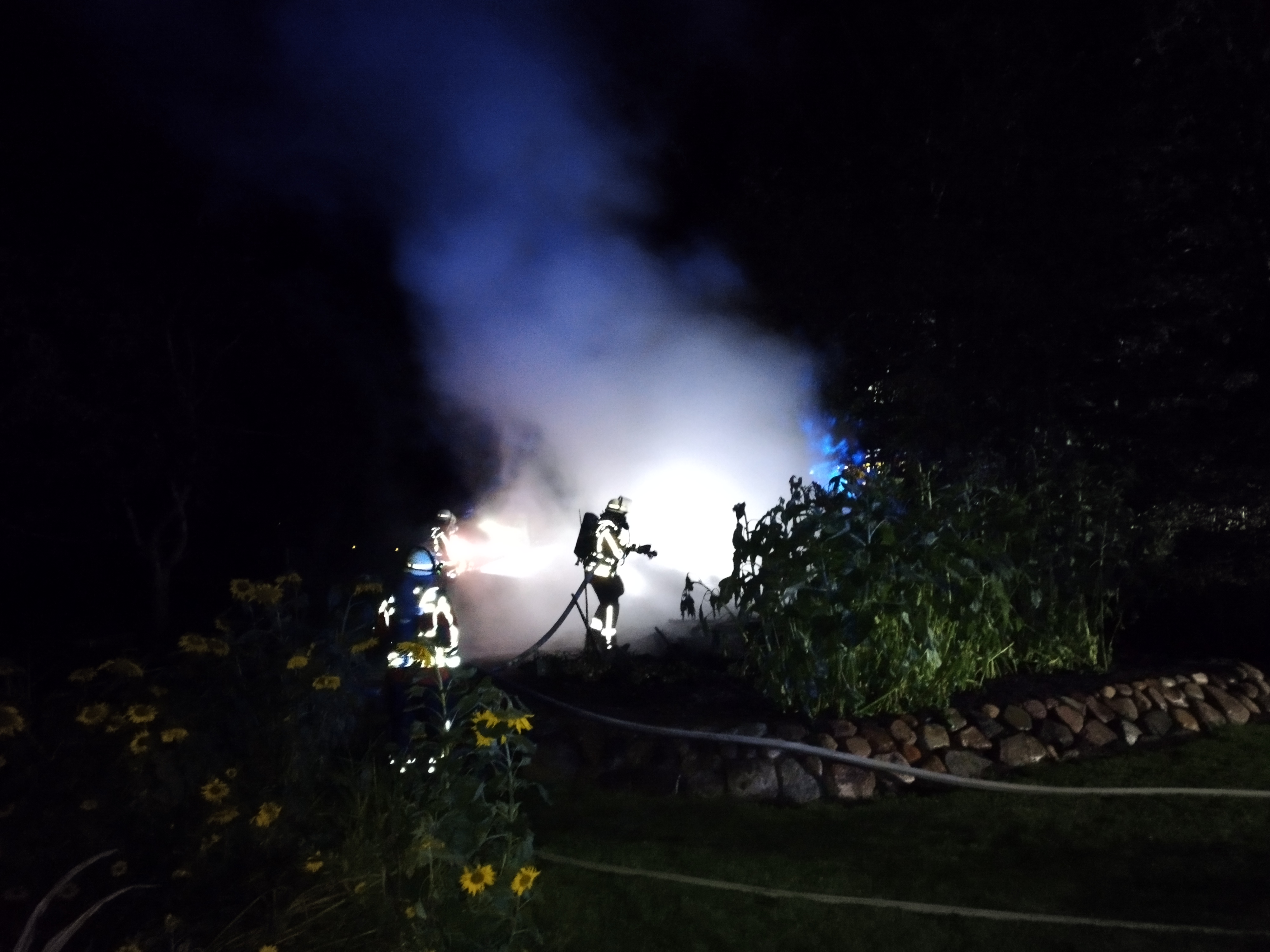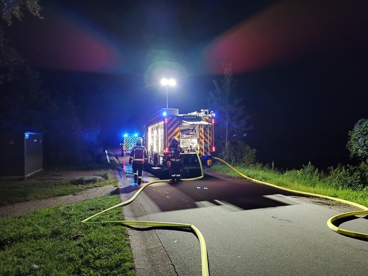 In der Nacht wurden wir aufgrund einer brennenden Gartenlaube alarmiert. Bei unserem Eintreffen standen die Reste der Laube in Vollbrand. Mit zwei C-Rohren und zwei Trupps unter schwerem Atemschutz war das Feuer zügig gelöscht. Dank unserer wasserführenden Fahrzeuge war der Aufbau einer Löschwasserversorgung nicht erforderlich. Somit konnten wir diesen Einsatz nach etwa 90 Minuten beenden.