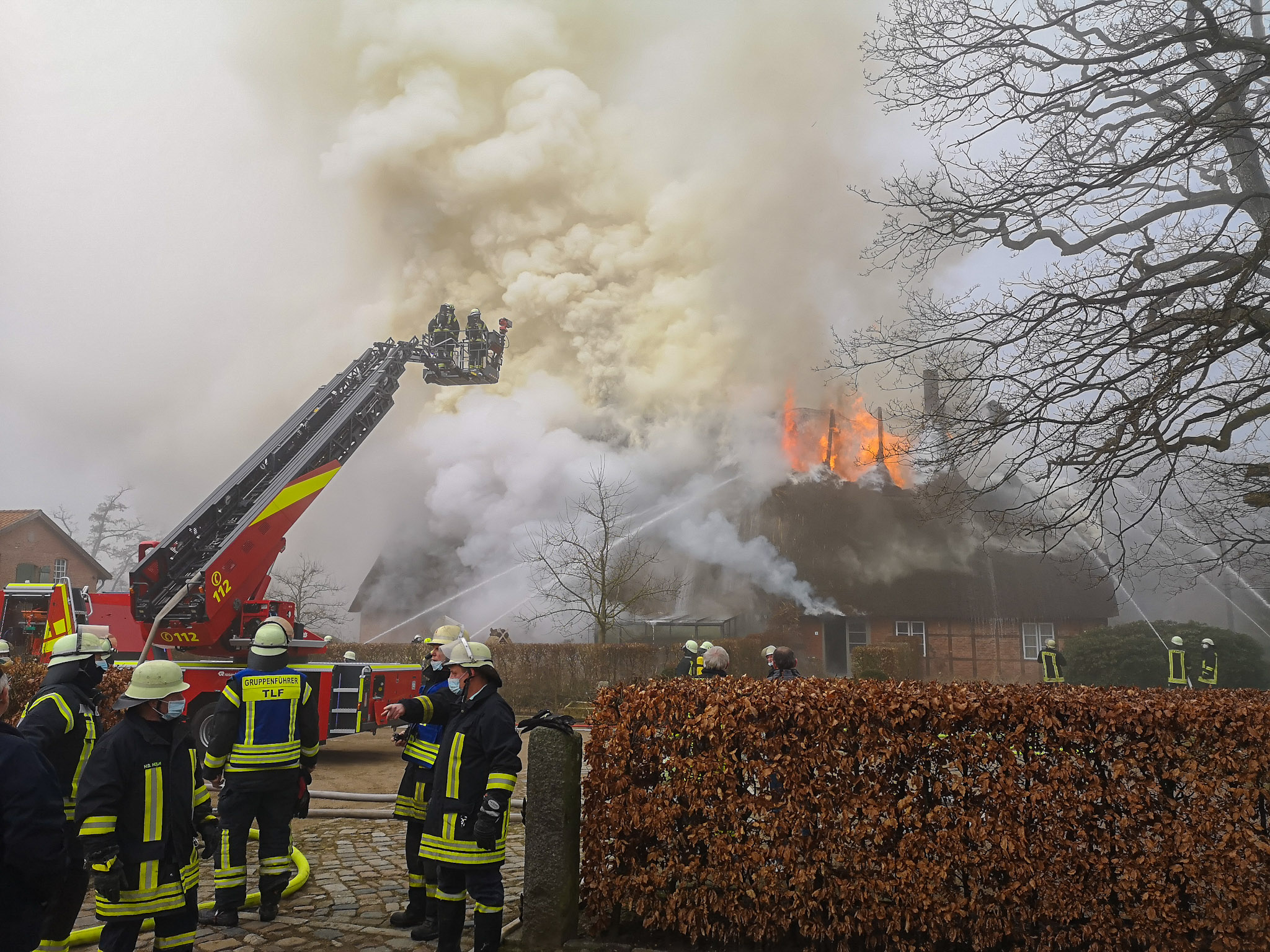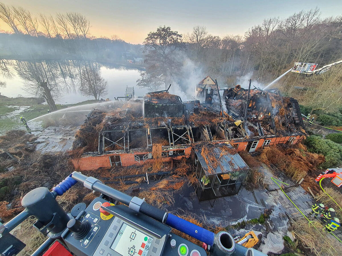 Da wir uns Zeitgleich schon bei einer Tragehilfe für den Rettungsdienst im Einsatz befanden, konnten wir schnell reagieren und die ersten Kräfte umgehend nach Beringstedt schicken. Vor Ort stand das Dach des historischen Reetdachhauses bereits in Vollbrand. Durch die angrenzende Au konnte schnell ein massiver Außen Angriff über 11 C-Rohren, unserer Drehleiter und dem Teleskopmast aus Rendsburg eingeleitet werden. Besondere Vorsicht bot ein großer Tresor in den mehrere Waffen und Munition lagerte. Ein Übergreifen auf andere Gebäude konnte verhindert werden. Verletzt wurde Niemand.