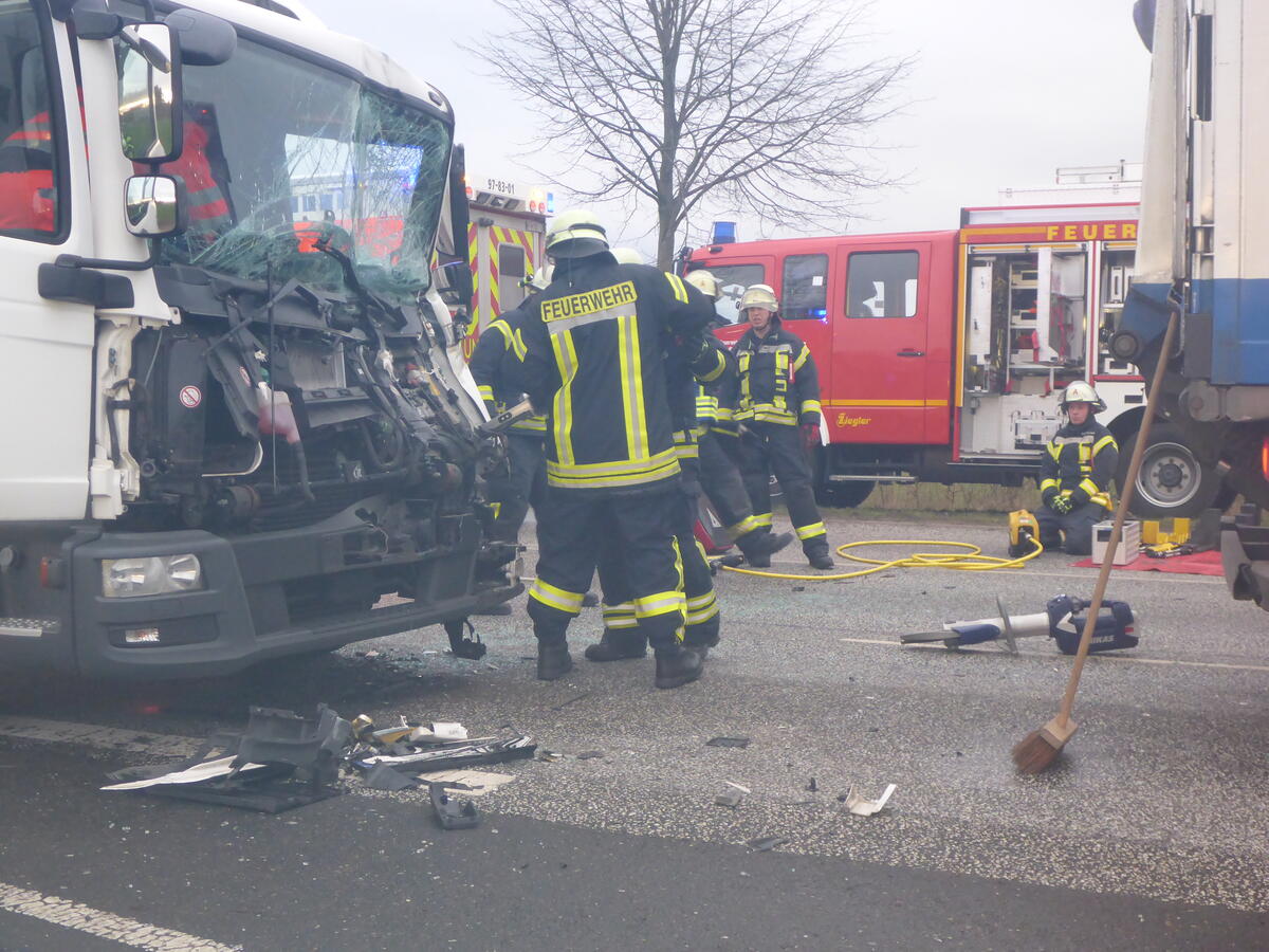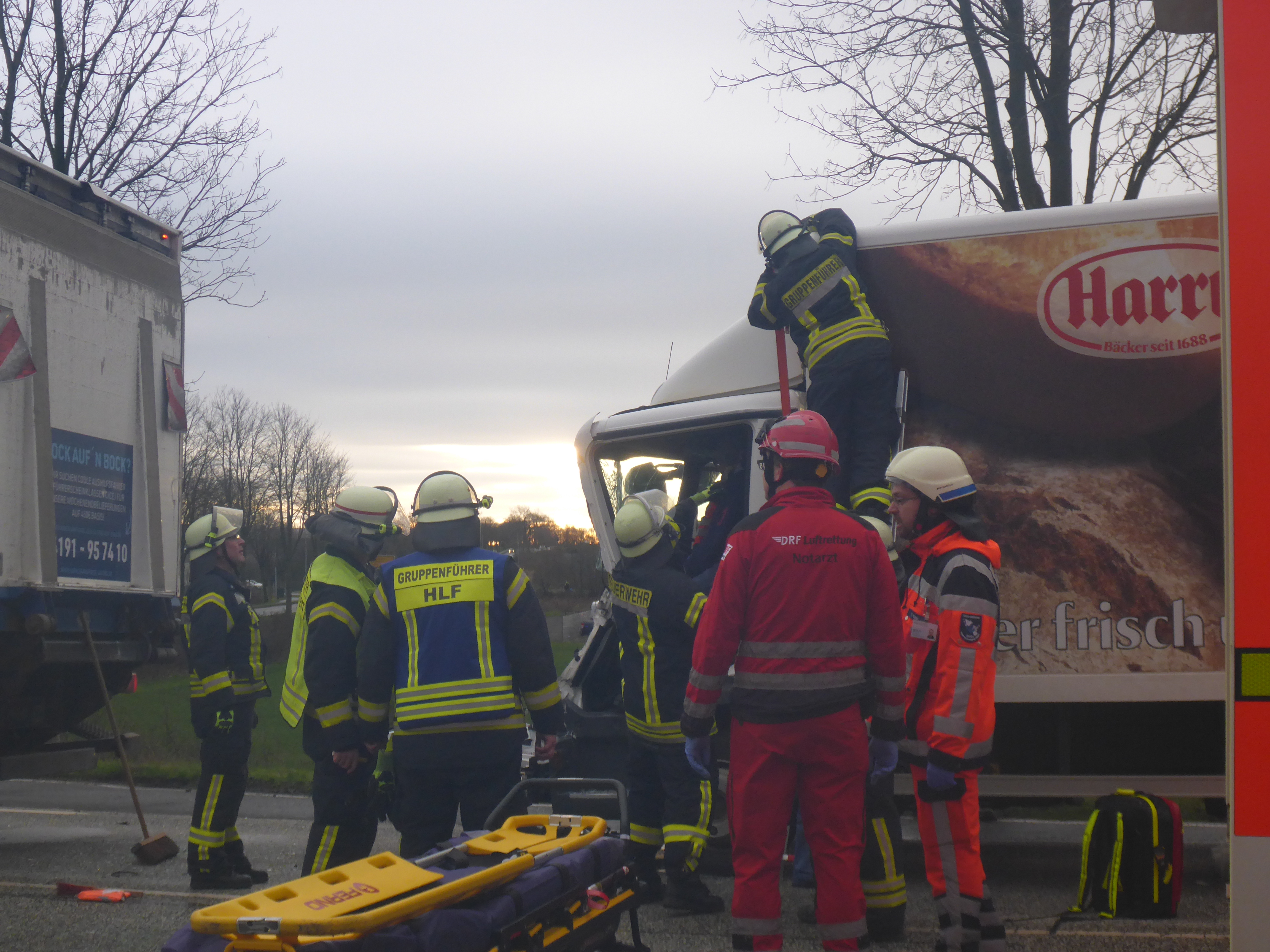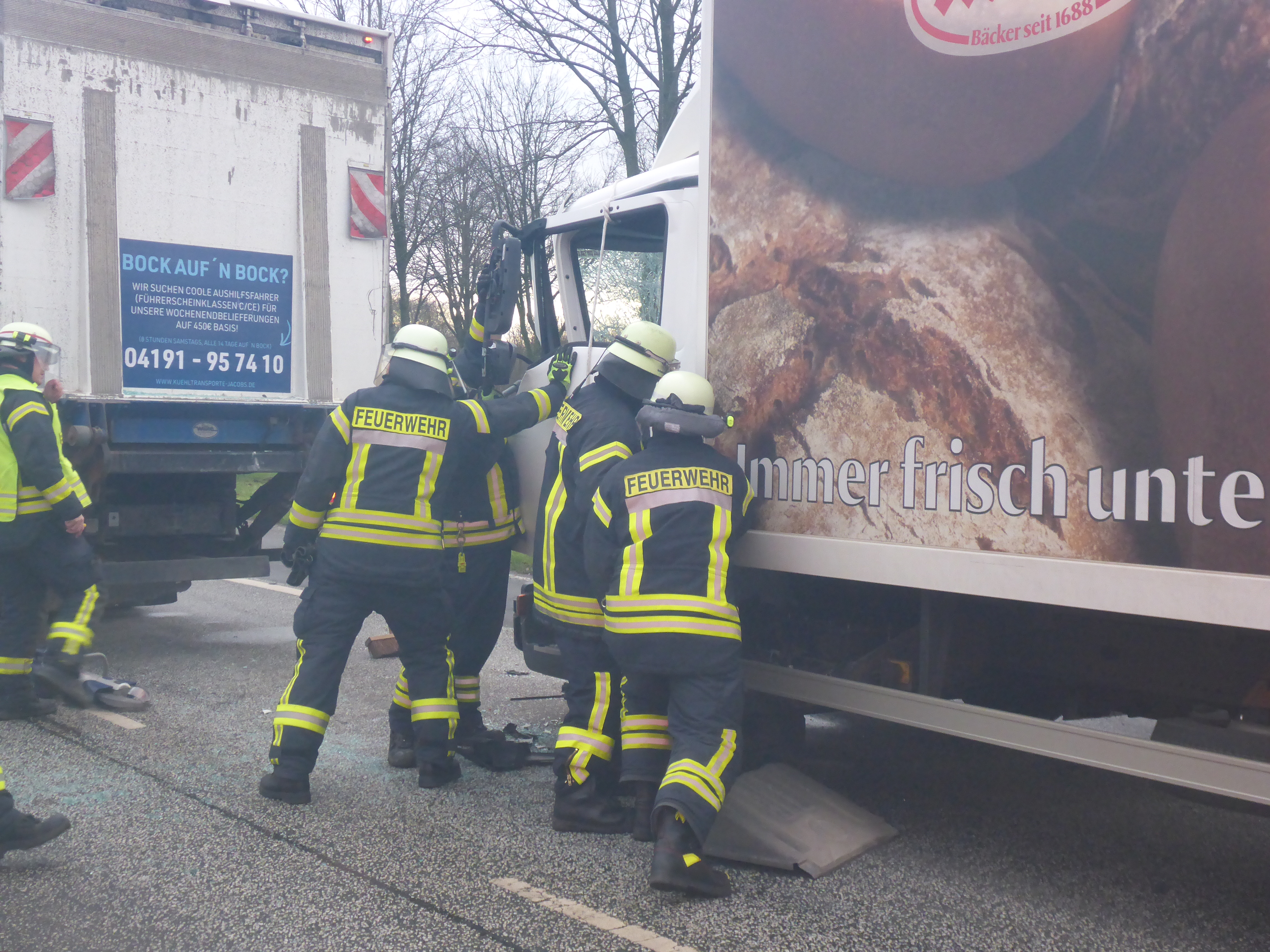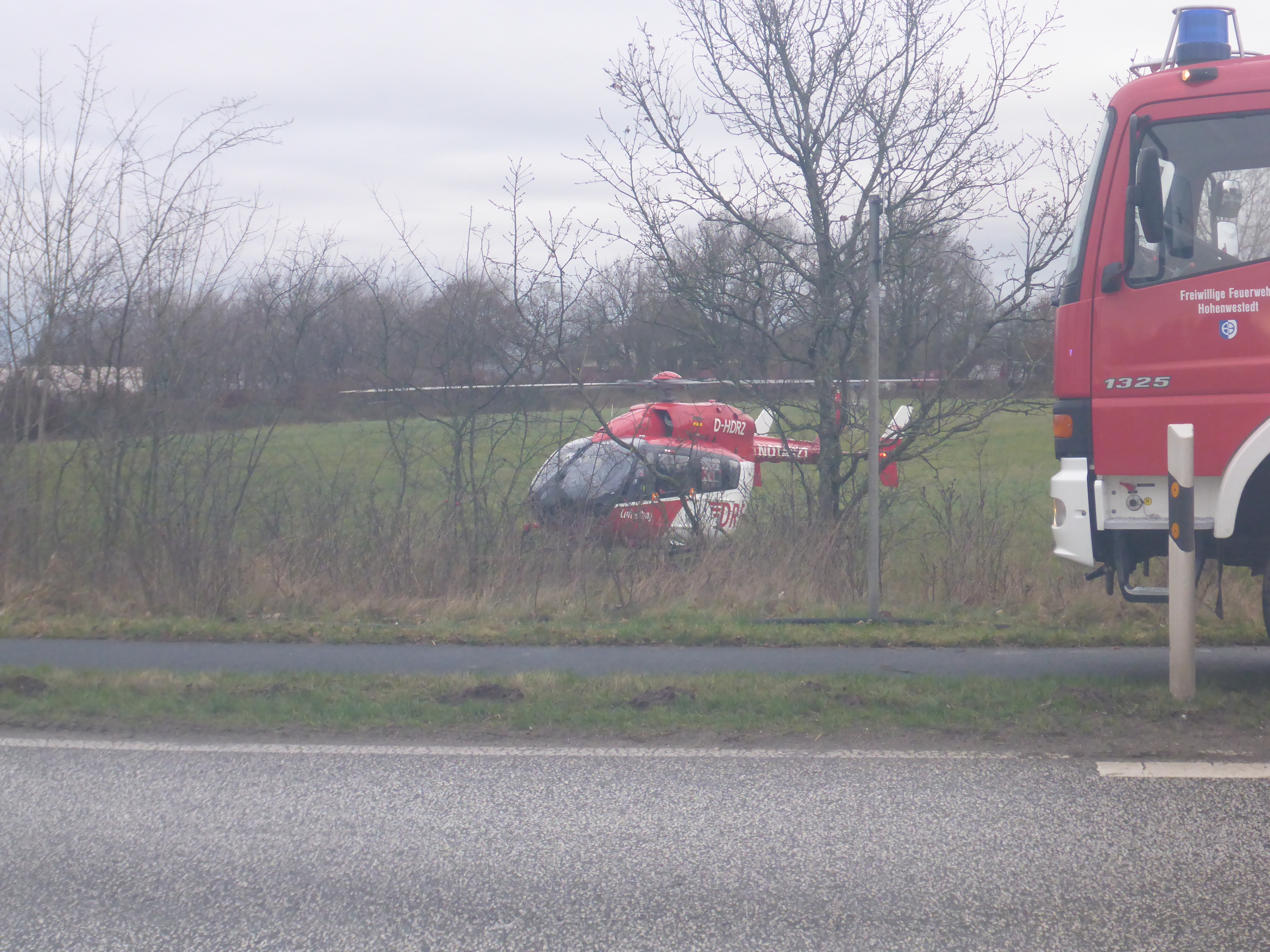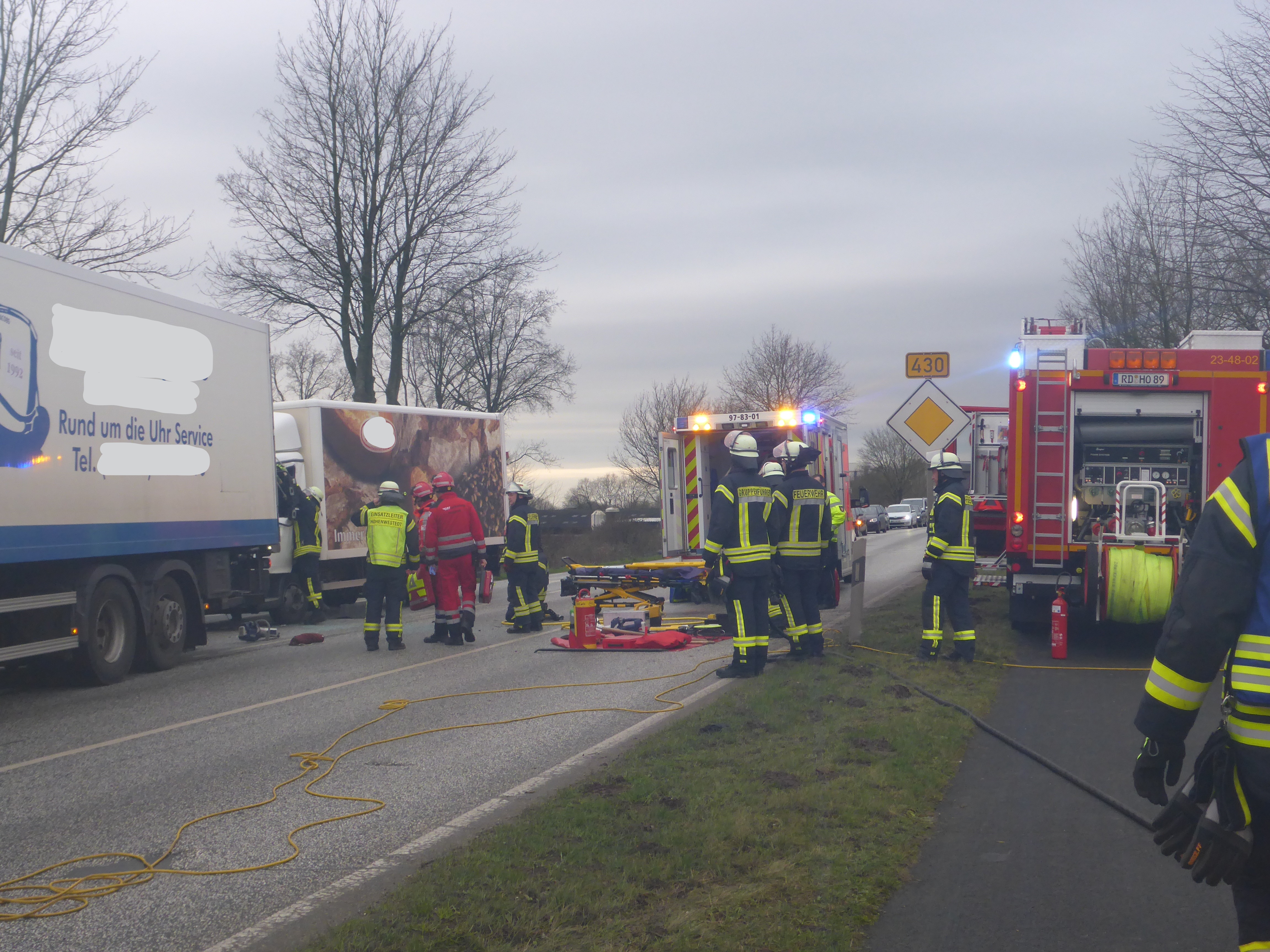 Am Morgen wurden wir mit dem Stichwort "Verkehrsunfall LKW, Person eingeklemmt" alarmiert. Nach kurzer Anfahrt bestätigte sich diese Meldung. Ein LKW war auf zwei stehende LKW aufgefahren. Dabei wurde der Fahrer des letzten LKW in seinem Führerhaus eingeklemmt. Von der Ladung der Fahrzeuge ging keine Gefahr aus, sodass wir uns ausschließlich auf die Befreiung des Eingeklemmten konzentrieren konnten. Der noch laufende Fahrzeugmotor wurde mittels CO2- Löscher gestoppt. Um Platz zu gewinnen, wurde der vordere LKW vorgezogen. Der Versorgungszugang erfolgte über die Beifahrerseite. Anschließend wurde die Befreiung mittels hydraulischem Rettungsgerät über die Fahrerseite durchgeführt.Nach etwa 25 Min. wurde der schwer verletzte Fahrer an den Rettungsdienst übergeben und in ein naheliegendes Krankenhaus transportiert.Neben der Freiwilligen Feuerwehr Hohenwestedt mit vier Fahrzeugen, war der Rettungsdienst mit einem Rtw, der Rettungshubschrauber Christoph 42 und die Polizei im Einsatz. Die Bundesstraße 430 war für die Dauer der Rettungs- und Bergungsarbeiten voll gesperrt.