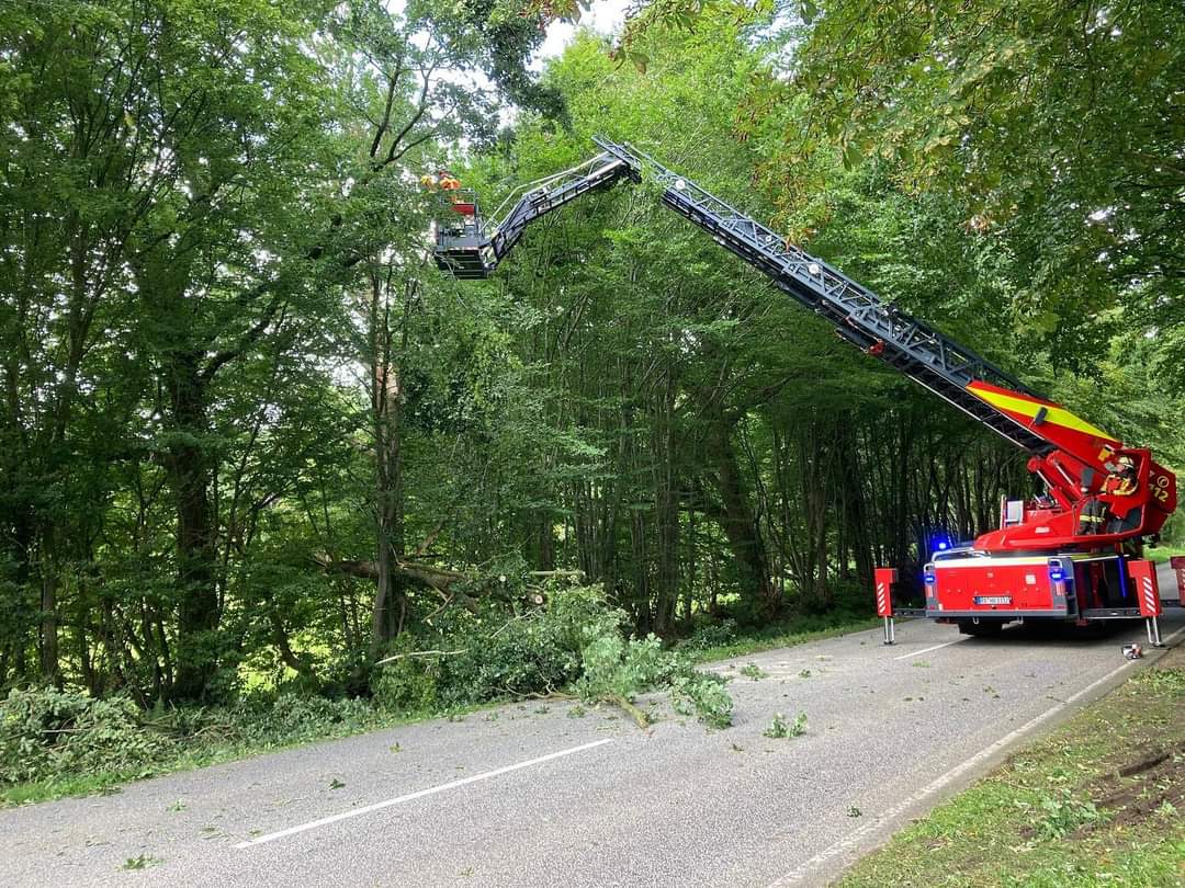 Am Nachmittag wurden wir zur Unterstützung nach Nienborstel alarmiert. Durch den starken Wind brach die Krone eines Baumes und landete auf der B77. Wir unterstützten mit der Drehleiter bei den Aufräumarbeiten.