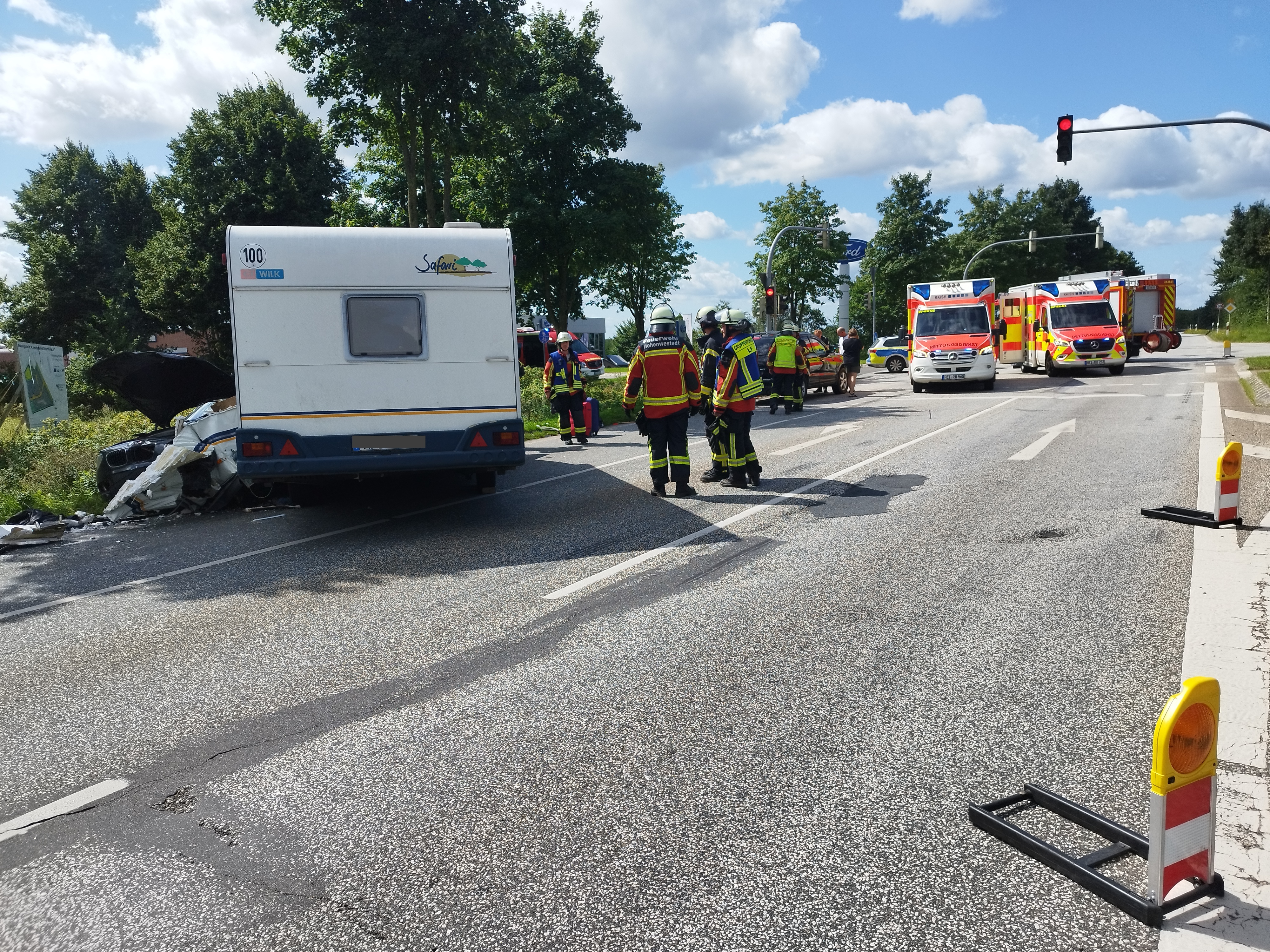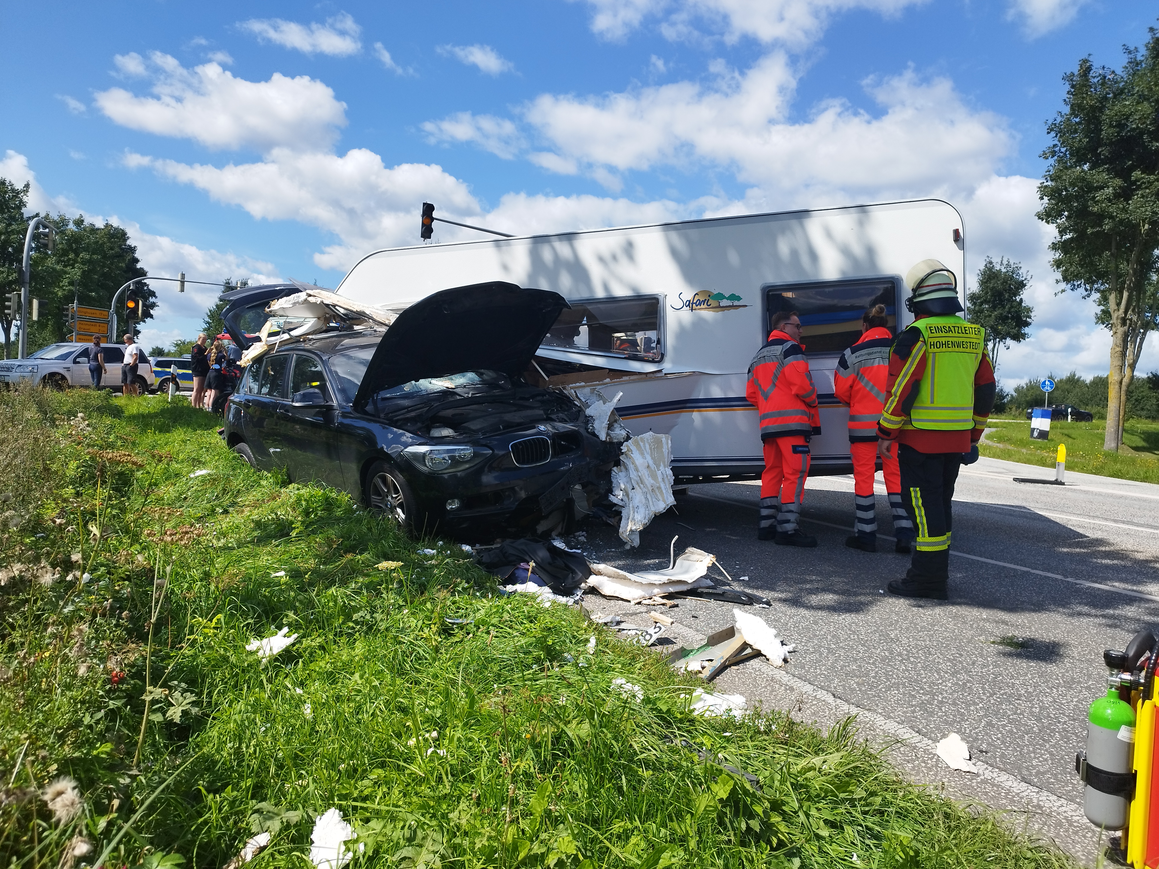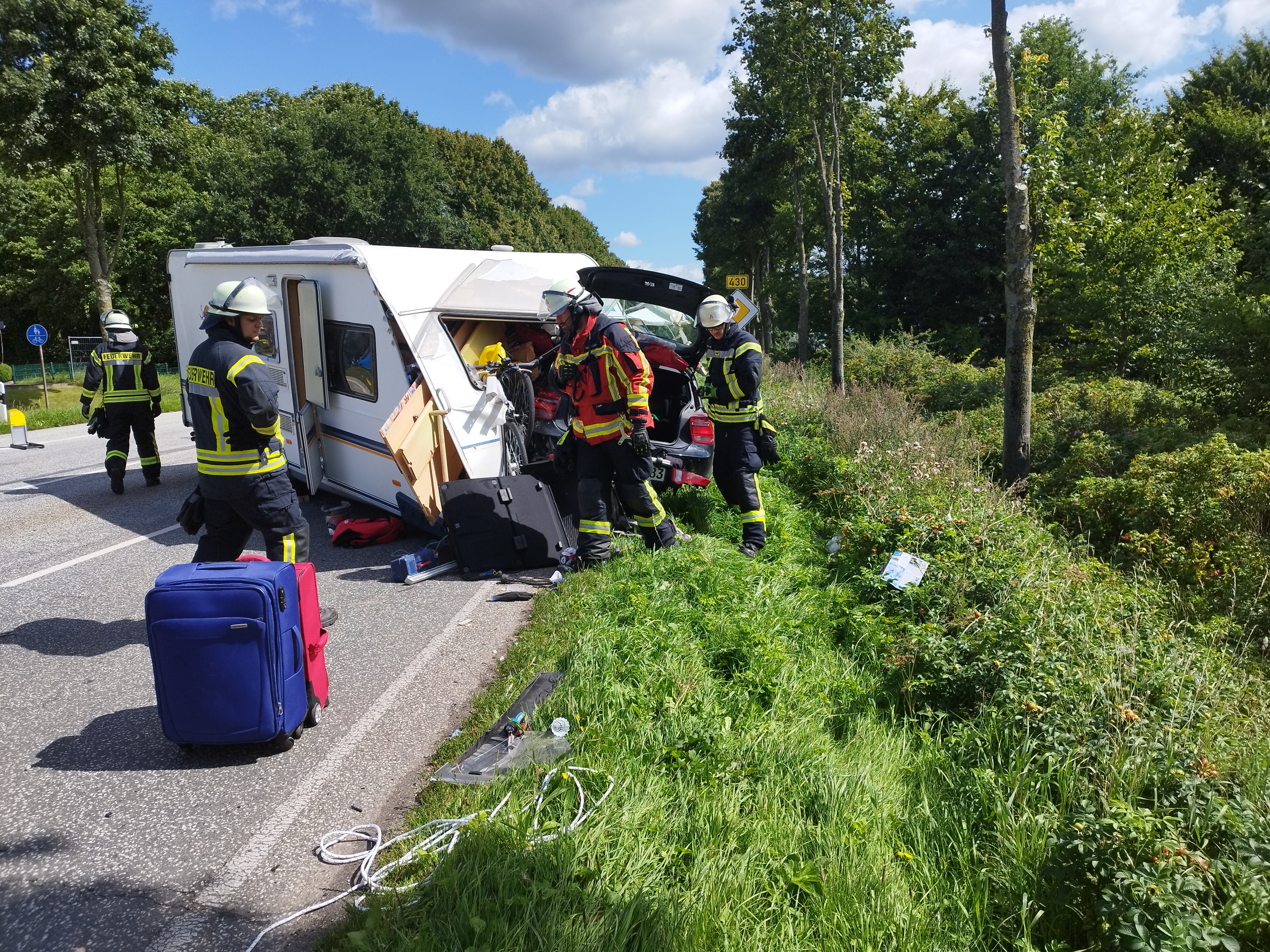 Zur Mittagszeit wurden wir auf Nachforderung des Rettungsdienstes zu einem Verkehrsunfall zwischen zwei PKW und einem Wohnwagen alarmiert. Insgesamt waren sechs Personen betroffen, wovon abschließend nur eine in ein Krankenhaus transportiert werden musste.