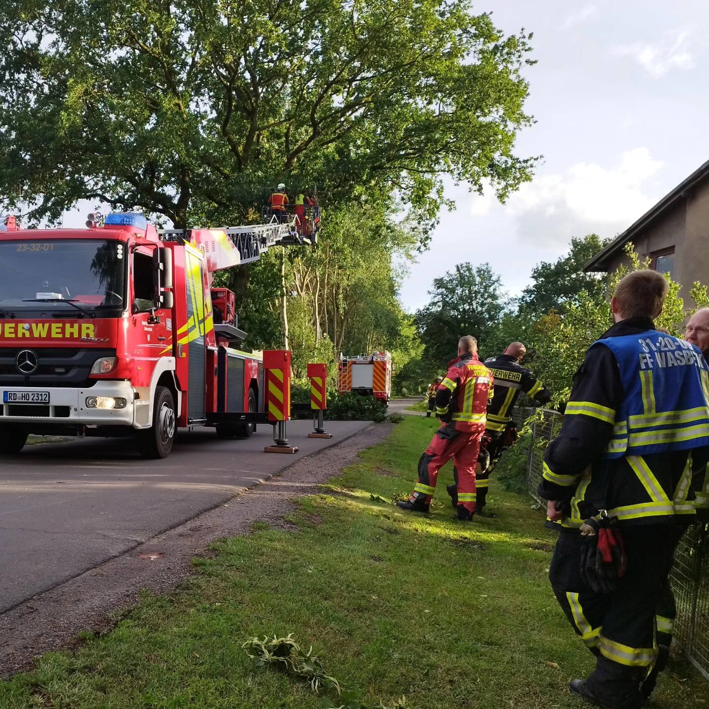 Am frühen Abend erhielten wir erneut Alarm. Diesmal ging es auf Anforderung unserer Kameraden der Feuerwehr Wasbek an die Stadtgrenze Neumünster. Hier waren nach einem Gewitter mit Sturmböen mehrere Baumkronen abgebrochen. Wir unterstützten hier mit unserer Drehleiter und konnten nach drei Stunden wieder einrücken.Wir bedanken uns an die Feuerwehr Wasbek für die tolle Zusammenarbeit!