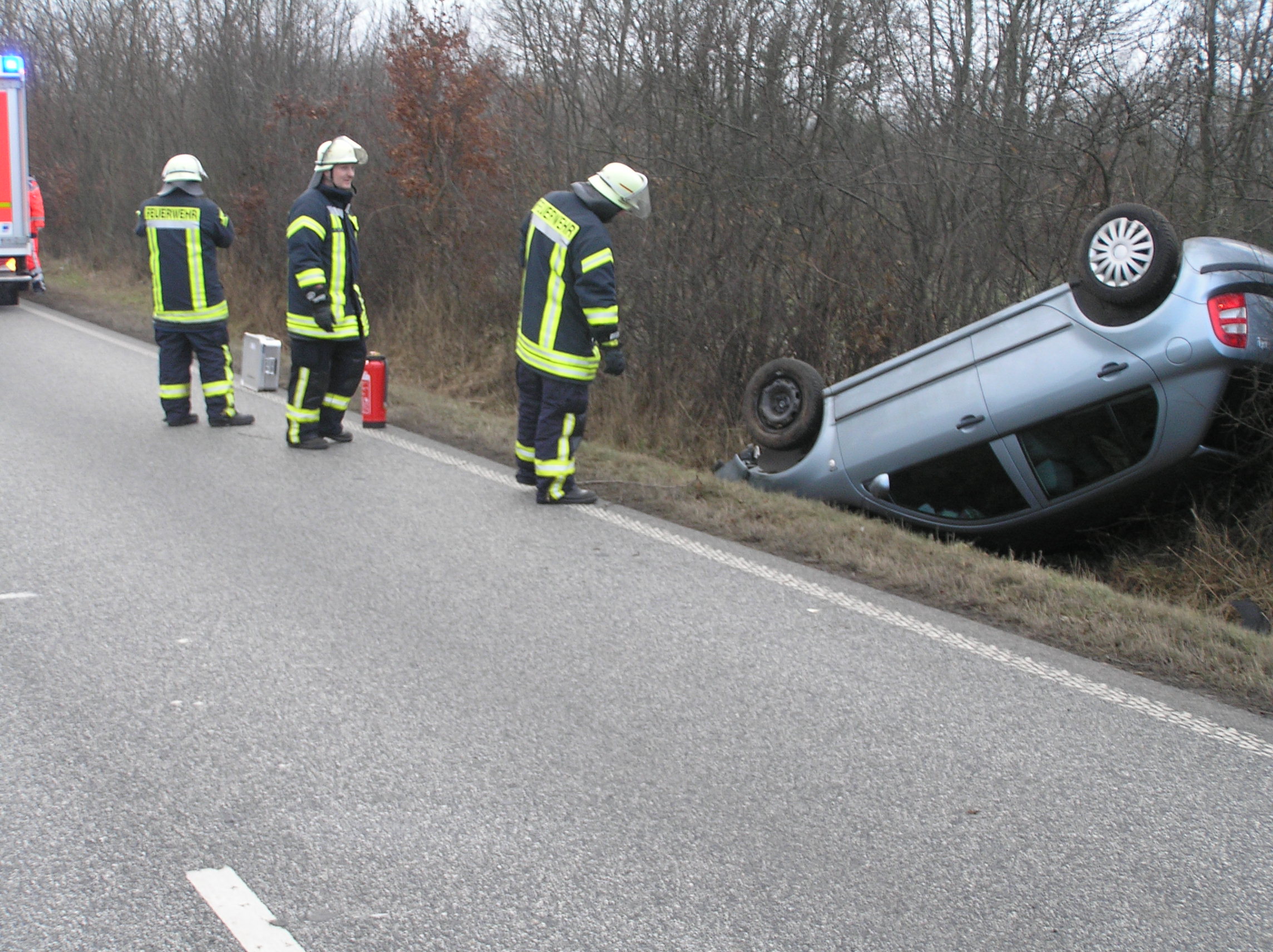 Am Dienstag, den 4.2. kam es dann gegen 15:45 Uhr zu einem Verkehrsunfall auf der B77 in Richtung Jahrsdorf. Dabei kam ein Kleinwagen von der Straße ab und überschlug sich, wobei das Fahrzeug auf dem Dach liegen blieb. Die Freiwillige Feuerwehr Hohenwestedt wurde mit dem Stichwort „Verkehrsunfall, eingeklemmte Person“ alarmiert. Vor Ort bestätigte sich diese Meldung zum Glück nicht. Die Fahrerin war bereits befreit und wurde vom Rettungsdienst behandelt. Im Einsatz waren neben der Feuerwehr mit drei Fahrzeugen und 14 Feuerwehrleuten, ein Rettungswagen, der Rettungshubschrauber aus Rendsburg und die Polizei.