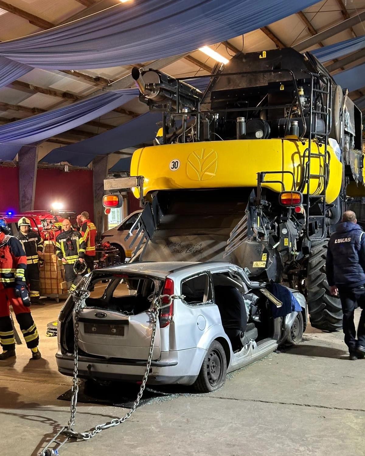 Extra dafür wurde von der Firma New Holland ein 24t schwerer Mähdrescher zur Verfügung gestellt. An dem Fahrzeug wurden diverse Situationen nachgestellt und unter Anwendung aller zur Verfügung stehenden technischen Geräte alle Szenarien realitätsnah beübt.